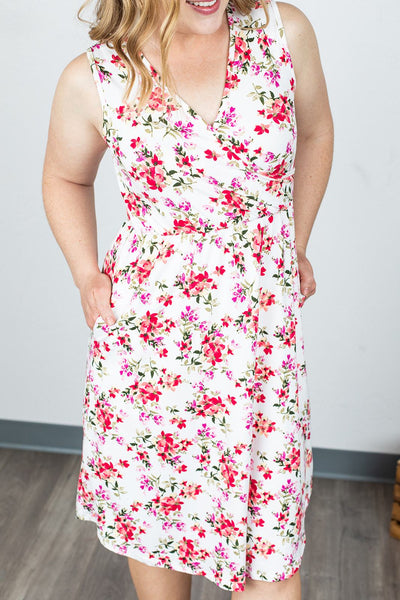 You know our gal pal Taylor? Our best-selling faux wrap dress with 3/4 sleeves? Meet her sister, Taryn! She's just like her sister, but sleeveless and great for this warmer weather! This dress is fully lined, has pockets, and runs true to size with good stretch! Due to the lining it has slightly less stretch than the other dresses in this same fabric.